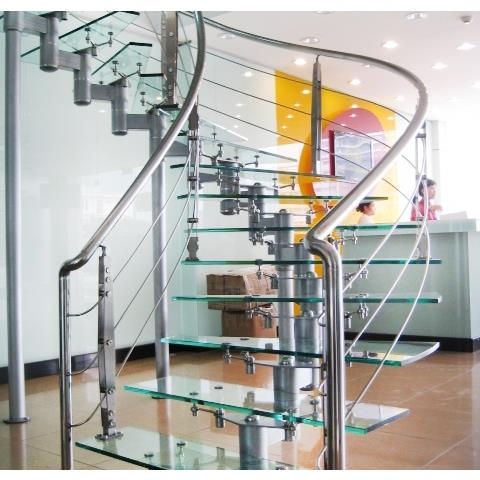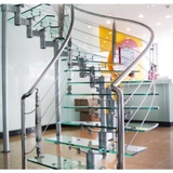 Cầu thang inox hình xoắn song song, bậc thang kính